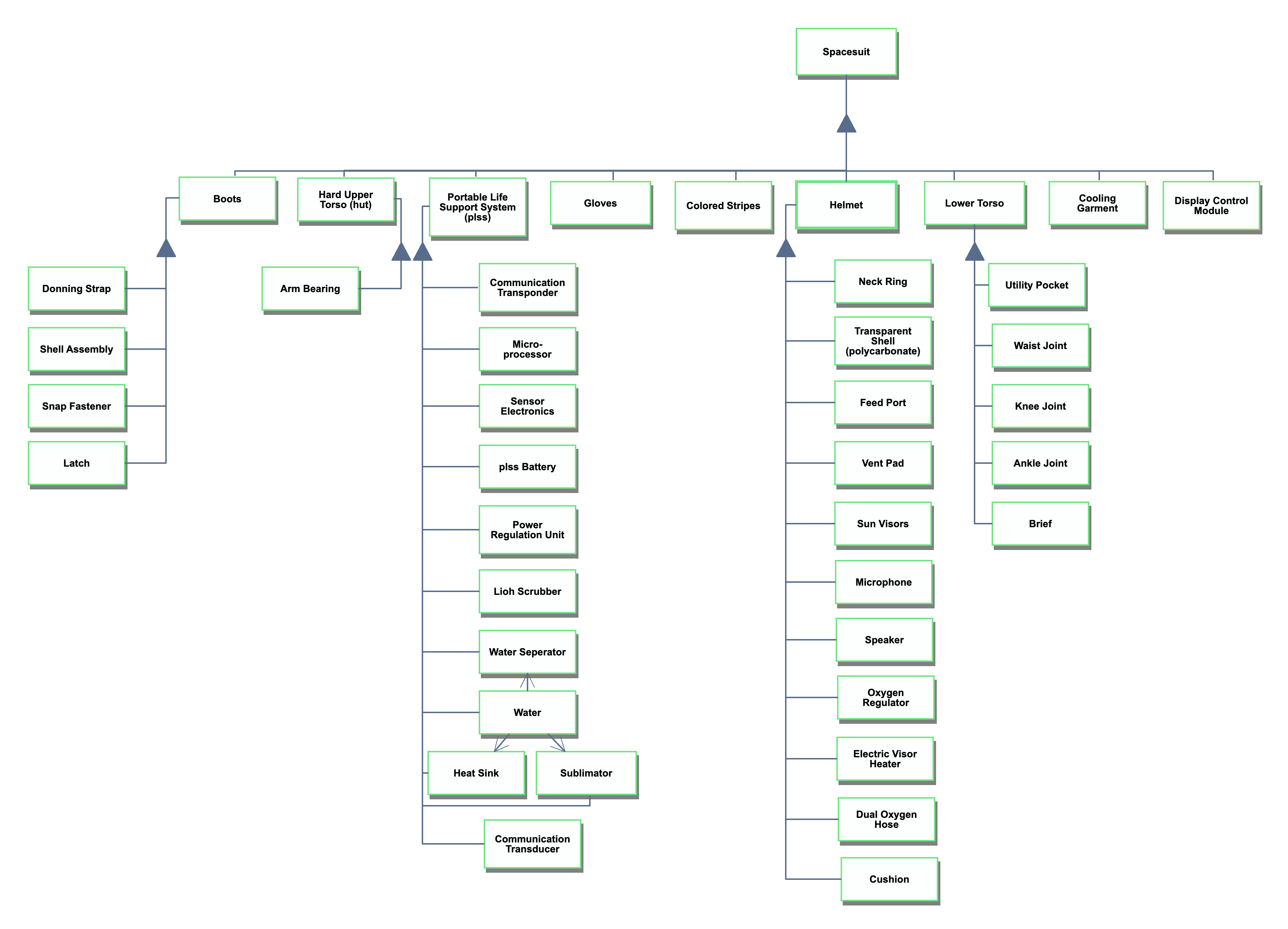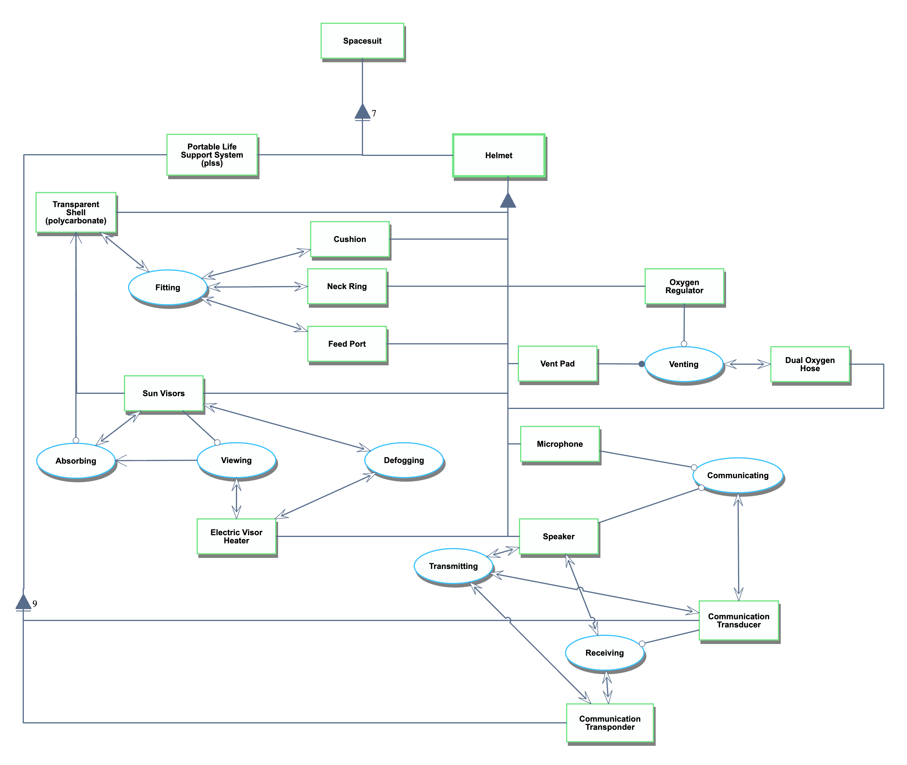 Below are two OPM models starting with the level 1 space suit which focuses on the physical connections of the spacesuit purely to showcase that the spacesuit helmet is a component of a larger system with a greater purpose of protecting an astronaut. The level 2 or unfolded spacesuit helmet provides a more comprehensive OPM model showcasing not only the physical connections but the processes that occur between those components. In the decomposed OPM of the spacesuit helmet it the PLSS is included as components of the PLSS interact with the helmet with the main interactions showcased being the communication transponder and transducer.