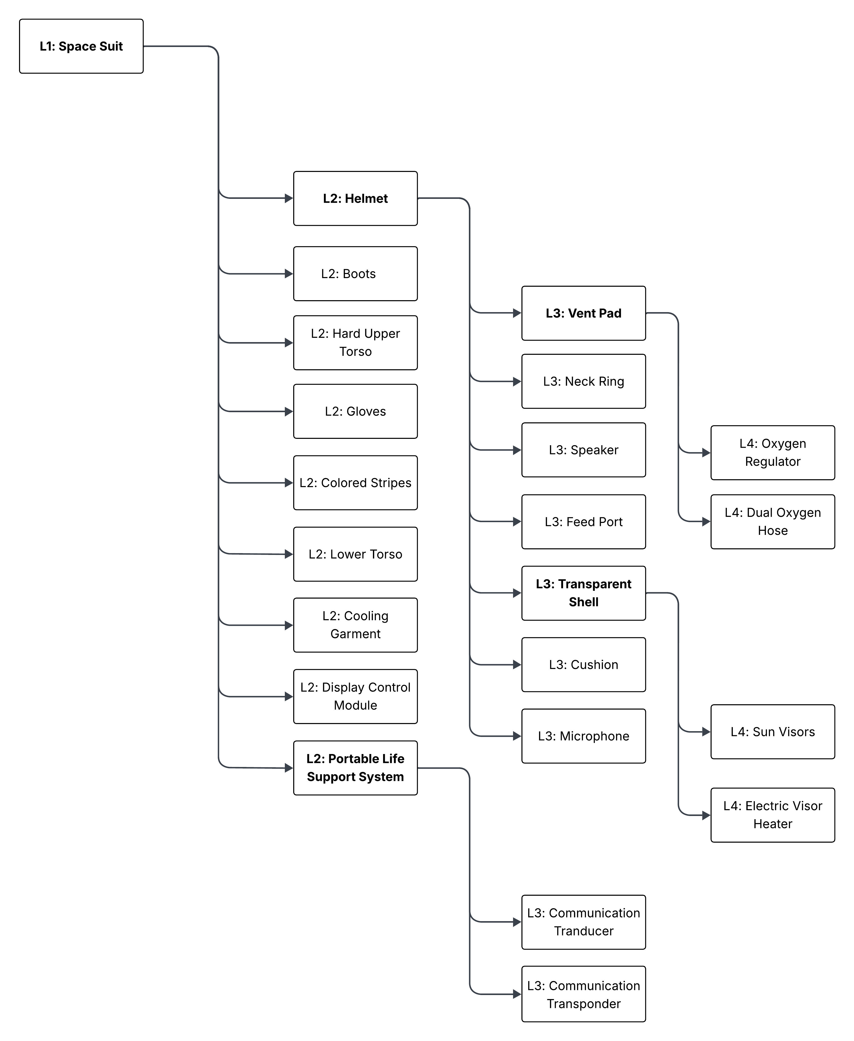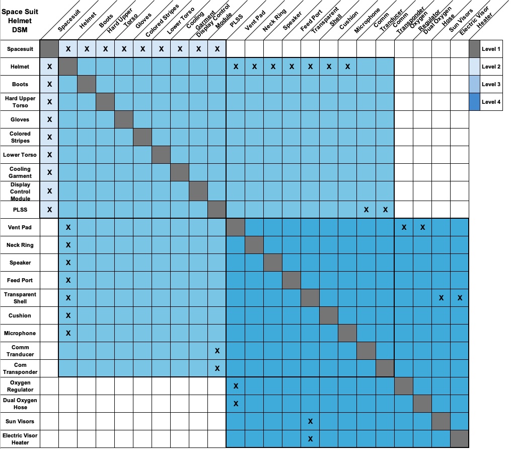 When viewing the spacesuit helmet through the lens of a DSM breakdown and allocation we can identify that the helmet is a level 2 product of the overall level 1 spacesuit. The spacesuit when decomposed can be broken down into the following main nine subcomponents below with additional subcomponent levels within those main components. Ultimately based on our DSM allocation matrix the spacesuit helmet is designed to support the overall goal and mission of the spacesuit working in tandem with other components such as the portable life support system (PLSS). Since we are focusing on the level 2 component spacesuit helmet we continue to decompose the helmet into its individual components which leads us to level 3 and 4 components such as the level 3 vent pad decomposing into the level 4 oxygen regulator and dual oxygen hose. DSM matrix allows complex systems such as the spacesuit and its helmet to be viewed in a less complex visual. It showcases relationships, interactions, and which elements are dependent on one another. Additionally, it is important to mention that this technology of the spacesuit helmet does not stand alone and it built upon the foundation of previous work done on the “Lunar EVA Space Suit" which is the level 1 system. Connections to level 2 and 3 components are also shown below to show the interdependencies of spacesuit helmet technology and its connection to existing roadmaps.