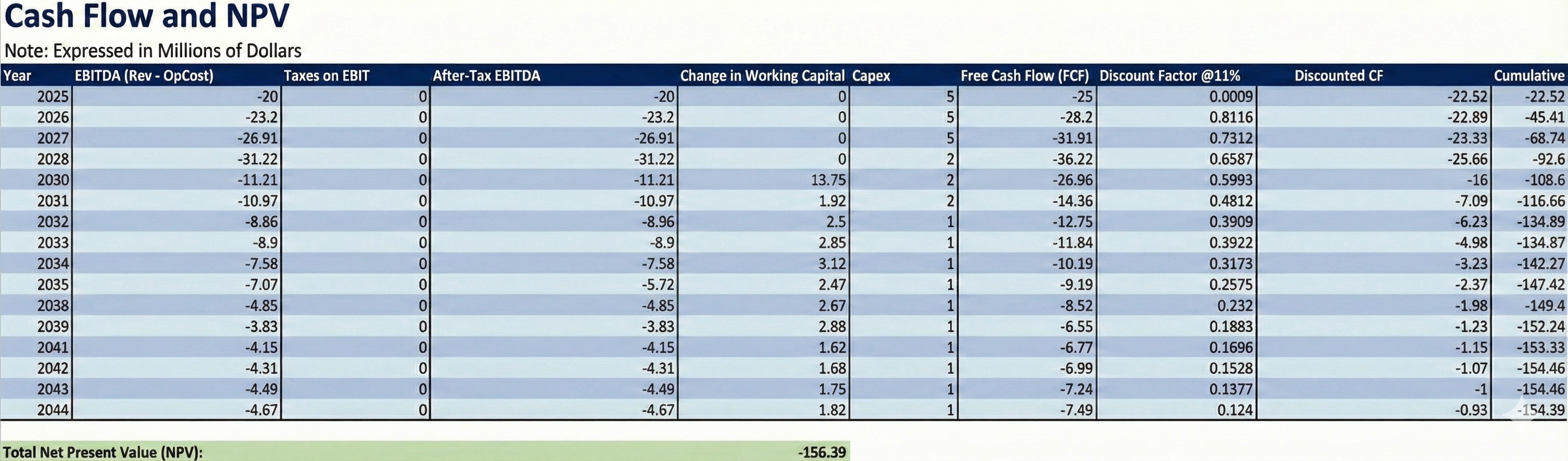 To evaluate the feasibility of the proposed advanced EVA Helmet and PLSS subsystem, we developed a 20-year financial model incorporating projected revenues, operating costs, capital expenditures, working capital requirements, taxes, and discounting.