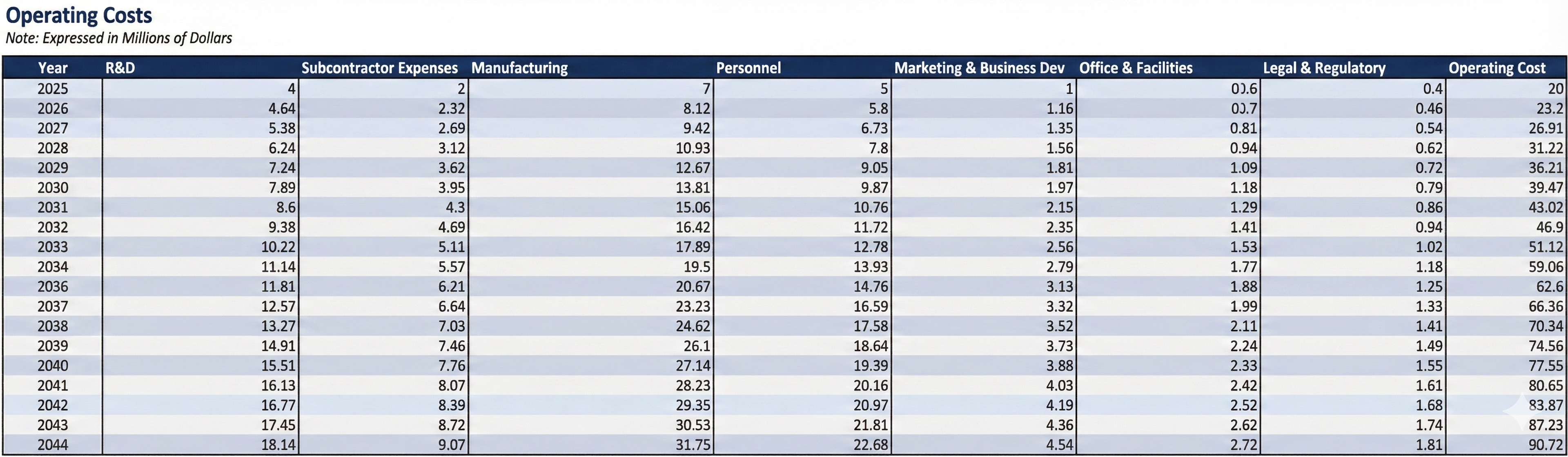 Operating costs are dominated by engineering labor, manufacturing, and subsystem testing. Capital expenditures are highest in the early years due to helmet fabrication, environmental chamber testing, sensor integration, reliability assessments, and PLSS compatibility verification. Working capital increases proportionally with revenue to account for inventory, production tooling, and testing capacity.