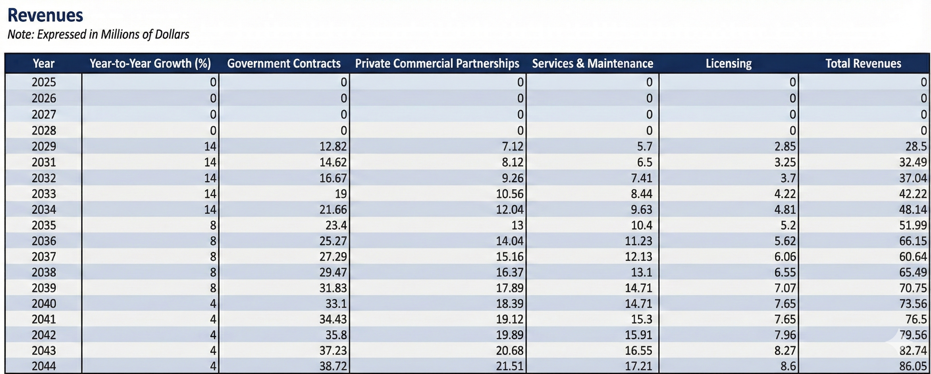 Revenue is assumed to begin in Year 5, reflecting the time required to reach TRL 6–7 through prototype development, vacuum chamber testing, PLSS interface integration, and human-rating evaluations. Revenue growth over time is driven by four sources, government contracts, commercial space partnerships, services and maintenance, and licensing with a balanced mix reflecting the evolving Artemis and commercial LEO ecosystem.