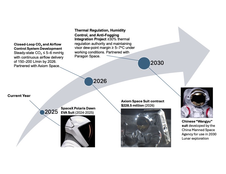 The second R&D project is Thermal Regulation, Humidity Control, and Anti-Fogging Integration, with a target of achieving ≥30% thermal regulation authority and maintaining visor dew-point margin ≥ 5–7°C under lunar workloads by 2026. This capability is an essential enabling technology to achieve our technical and business goals for clear visual field & clarity, stable temperature control, and reliable cooling power.