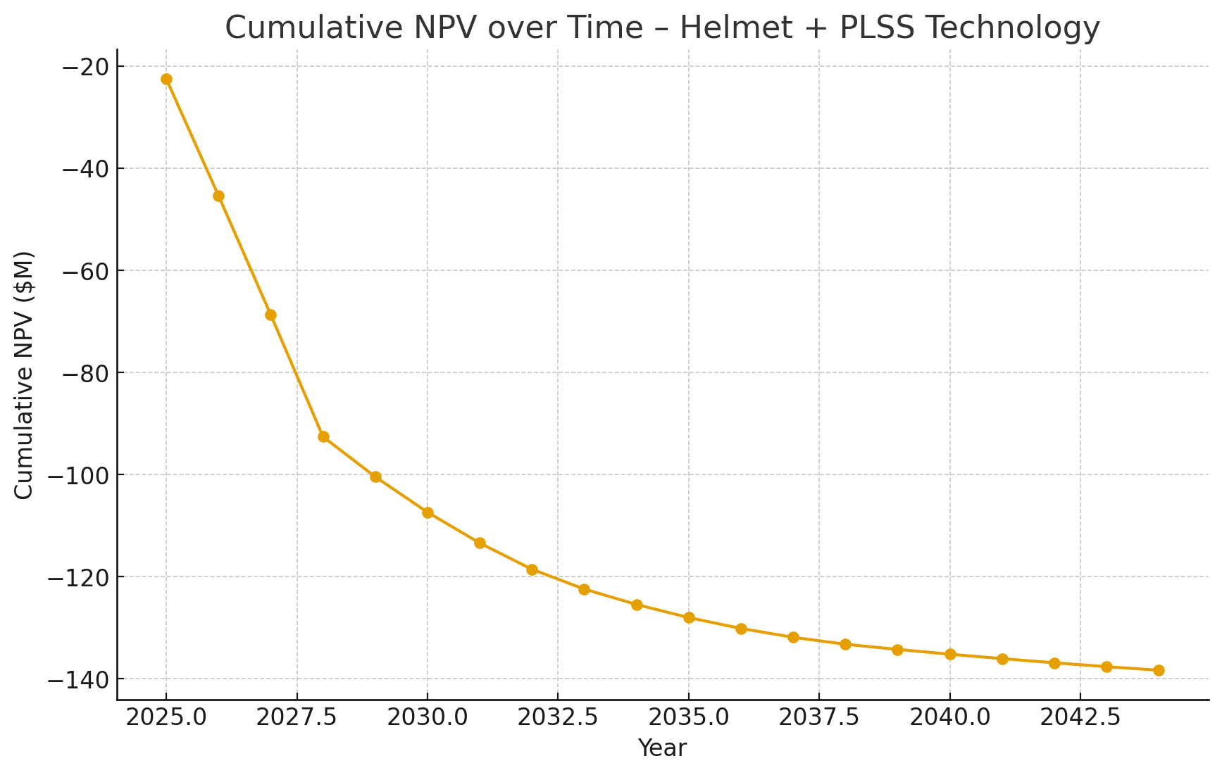The cash-flow results, discounted at 11% to reflect the technical and programmatic risks of EVA life-support subsystems, show that cumulative NPV remains negative across the 20-year horizon. This behavior is expected: EVA hardware is extremely expensive to develop, has long certification timelines, and is produced in very low volumes. As a result, even moderate revenues are insufficient to overcome early development costs under conservative assumptions. This outcome is consistent with real-world EVA system economics, where strategic mission value, crew safety, performance, and reduced risk drive investment more than direct profitability.