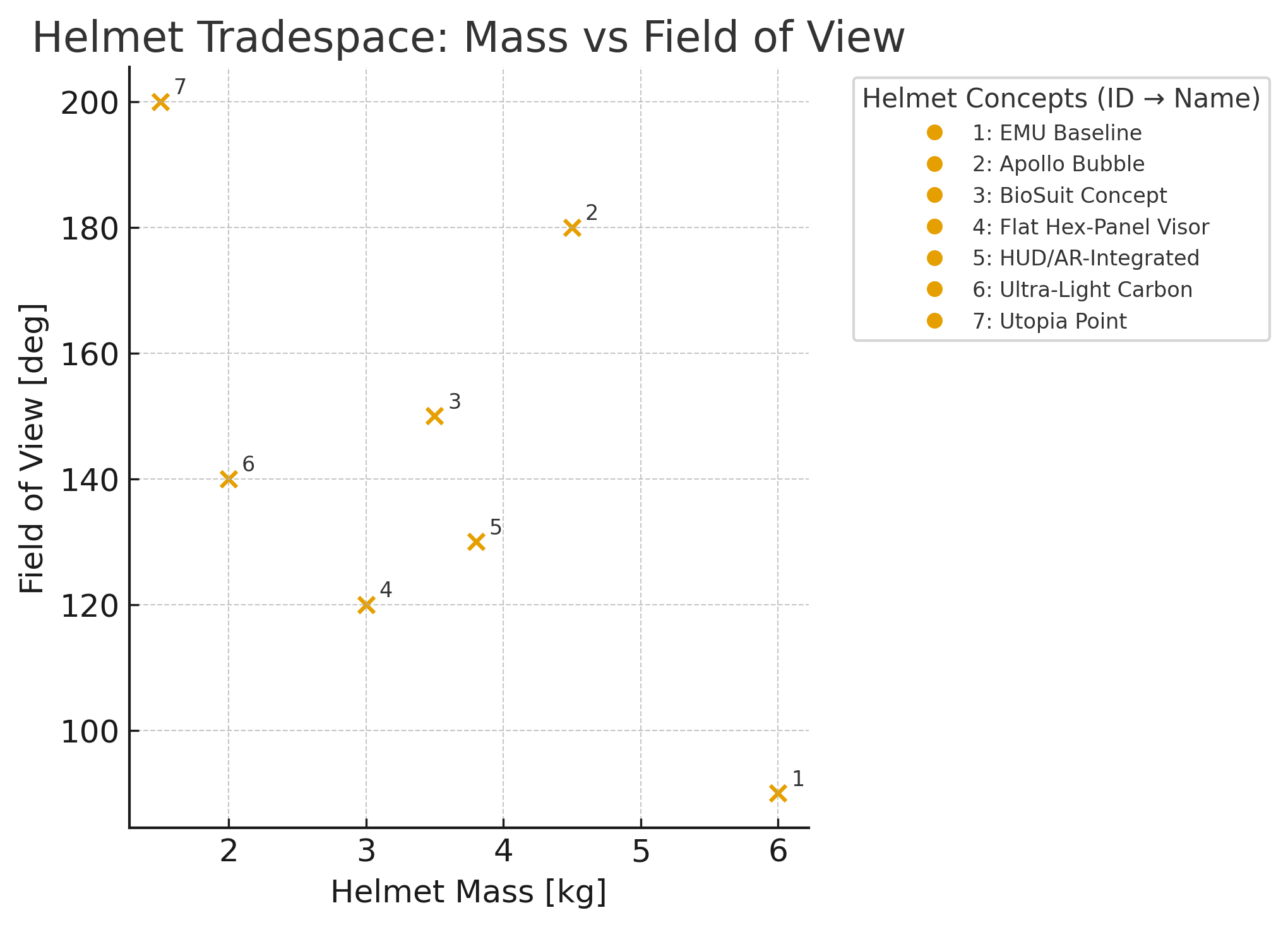 Figure 12: Morphological Matrix (Helmet–PLSS Options): with qualitative options for each subsystem (in rows). Selecting one option per row defines a complete concept for analysis.