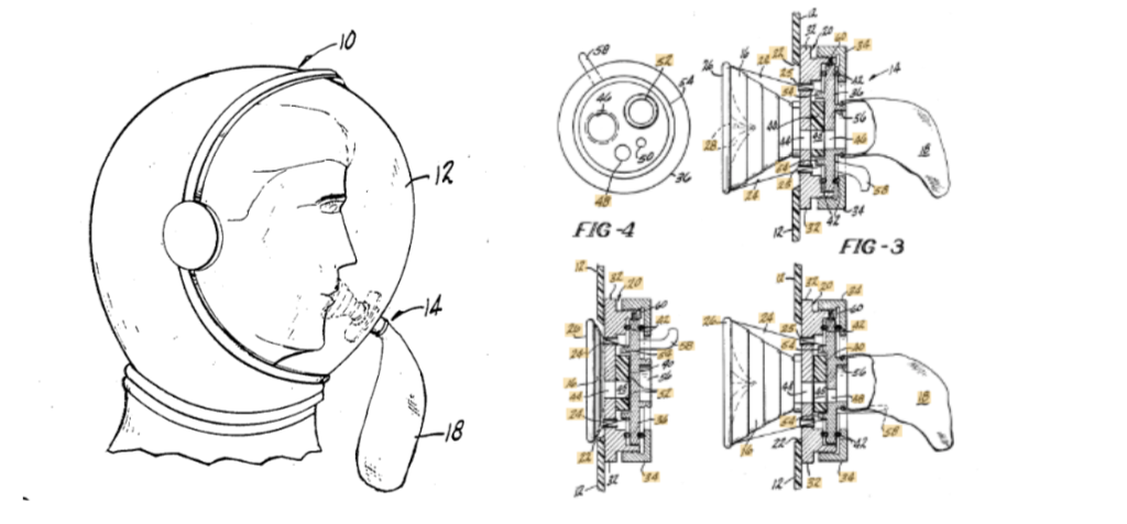 Relevancy of patent three: As mentioned above this patent was one of the first inventions regarding waste disposal in spacesuit helmets. While the exact design of a pouch may be outdated the principles and underlying mechanism remain very relevant today. The idea of keeping the suit pressurized and not obstructing the view of the astronaut are still principles and FOMS focused today by spacesuit developers and NASA. What is probably more relevant is the mechanism in which the vent was sealed as that is a problem in all spacesuits, leaking of oxygen. What our team can take away from this patent is the idea of a vent mechanism that could ultimately serve multiple functions. While this patent focuses on waste removal there are other applications such as tools or helpful fixtures that could instead be mounted on the helmet to assist an astronaut.