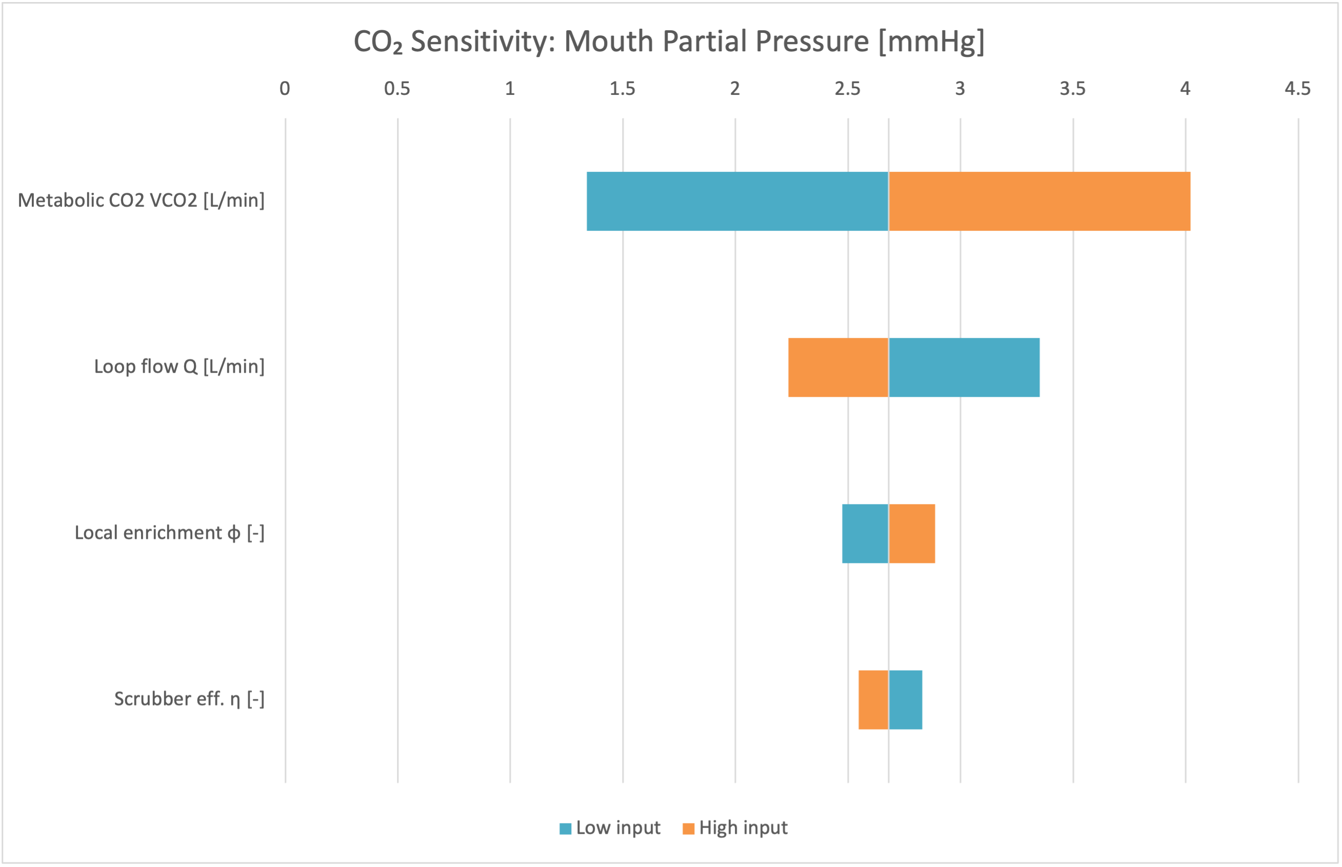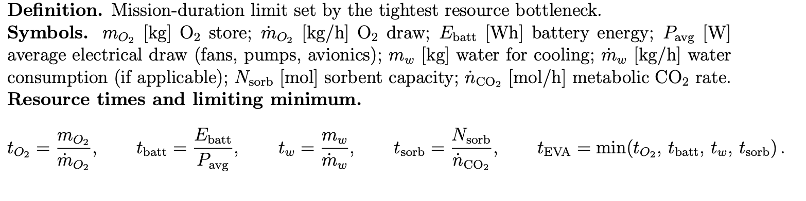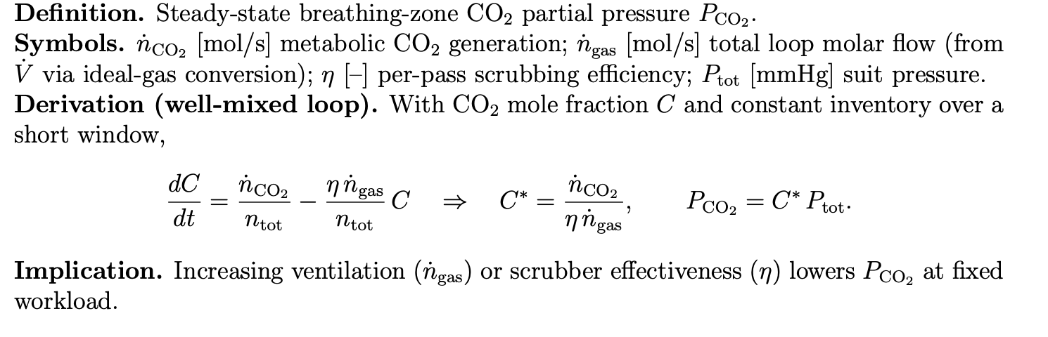 This section formalizes the technical models behind our Helmet ↔ PLSS FOMs and the sensitivity study that feeds the tornado charts. For each FOM, we state the definition, symbols, and a compact derivation so the causal path from design choices → physics → mission outcomes is explicit. Assumptions (steady-state vs. transient windows, well-mixed control volumes, ideal-gas conversions, and component efficiencies) are chosen to keep models identifiable with data we can collect this term [7].