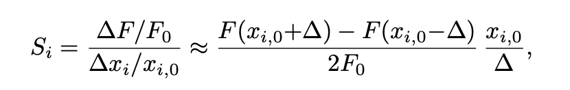For each parameter xi we evaluated F(xi,0−∆) and F(xi,0+∆) and plotted those two FOM values as the left/right bars, with the baseline marked by a vertical line. Categories are ordered by F(xi,0+∆)−F(xi,0−∆) to form the tornado shape; the signed, normalized Si above correspond to the same perturbation [8]