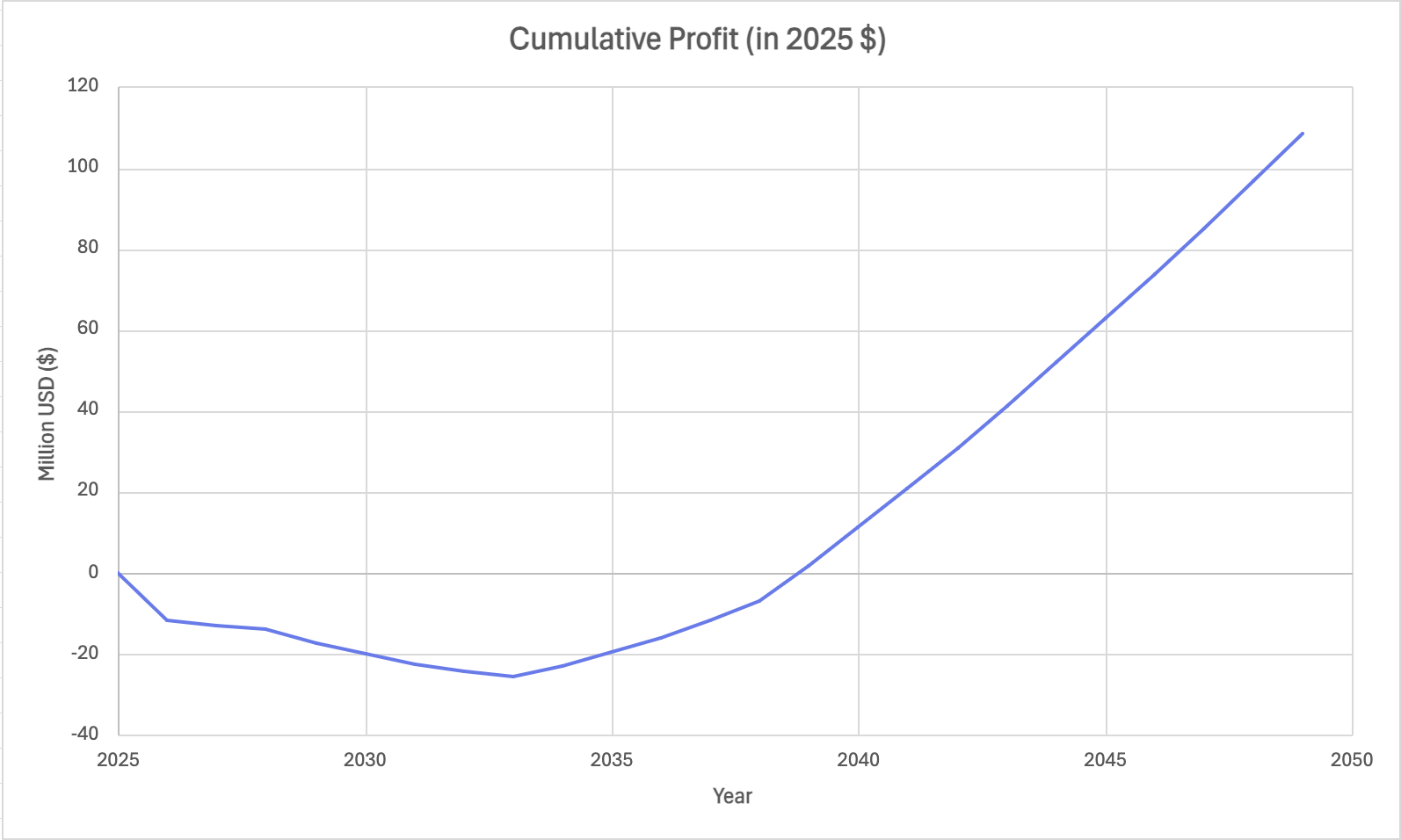 In summary, this investment becomes profitable in 2035. By 2040, the initial development cost will have been fully recovered.