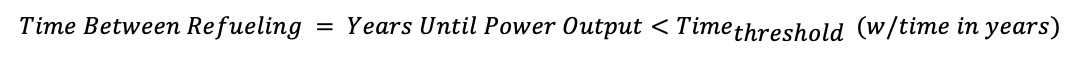 Time between refueling represents how long the system operates before the power output drops below threshold and refueling is required.