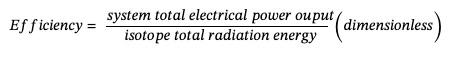 Efficiency is the ratio of usable electrical power to the radioactive energy emitted by the isotope.