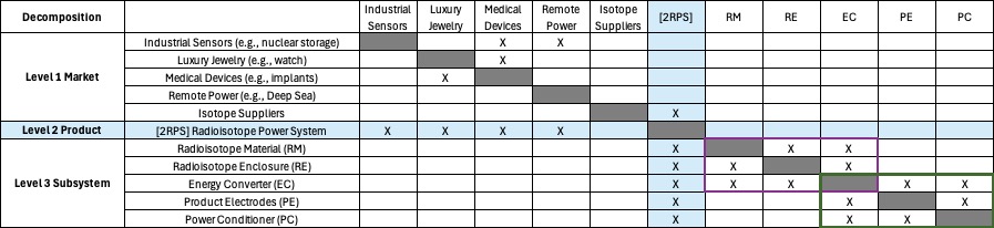 This Level 2 technology roadmap focuses on the product-level development of RPS. It examines how improvements in radioisotope selection, decay energy use, converter efficiency, and thermal management improve overall system performance. The roadmap focuses on Figures of Merit such as power density, efficiency, lifespan, and reliability. By tracking these measures, we can see how technical advances in components increase mission reach, reduce operational risk, and extend service life in scientific, industrial, and defense applications.