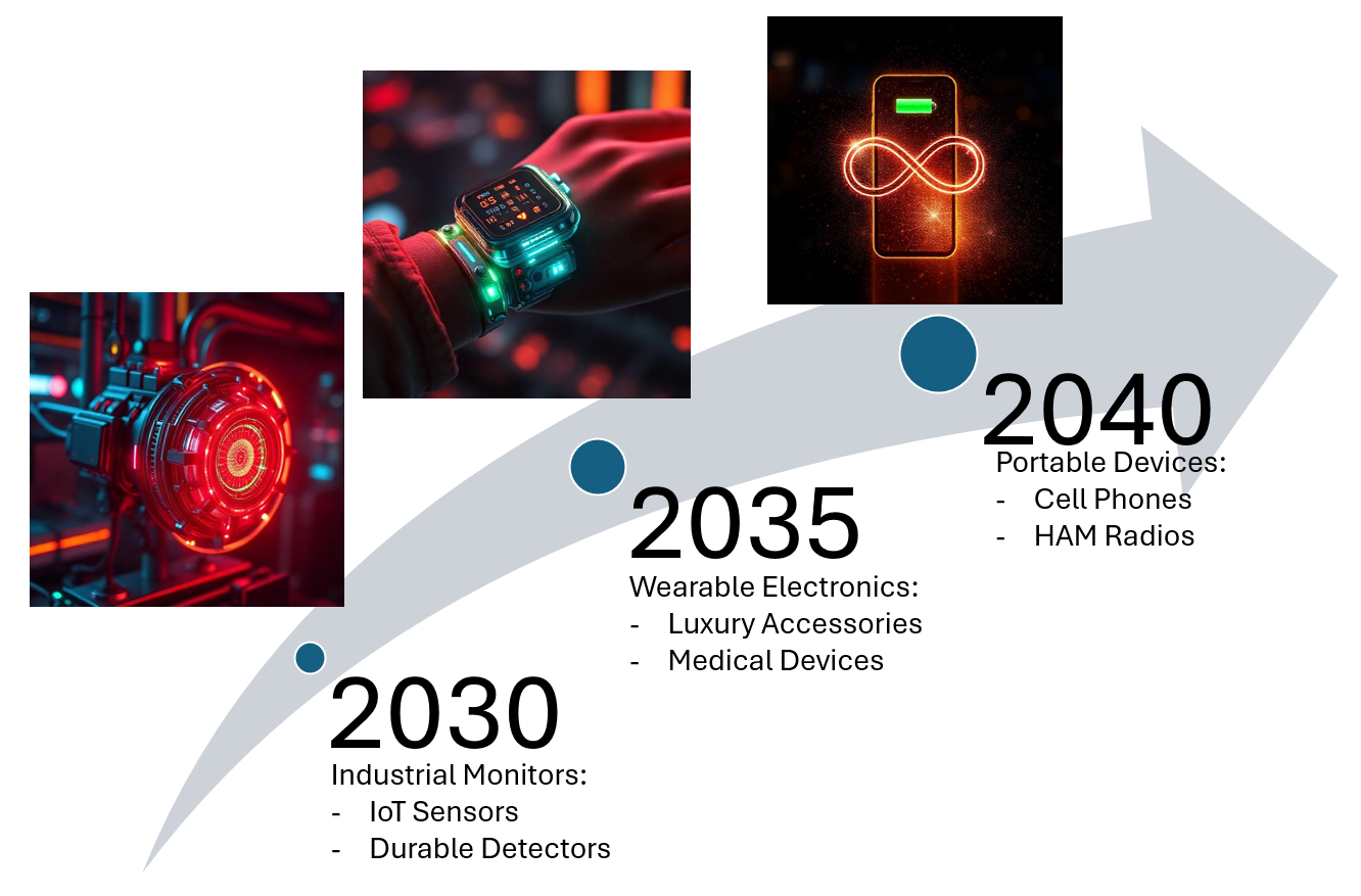 We will explore the use of betavoltaic power sources for low-power IoT devices by 2030, with a focus on long-life sensors and infrastructure nodes. By 2035, we will expand into wearable electronics, including medical, fitness, and entertainment applications, where flexibility and durability are critical. By 2040, we aim to promote the adoption of ultra-long-lasting, maintenance-free consumer devices in the portable electronics sector.
