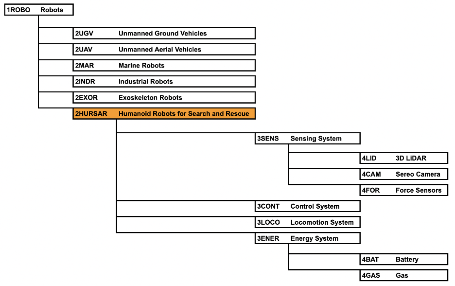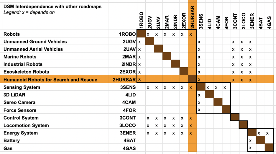 The DSM below organizes the main categories of robotic systems together with the subsystems that make them work. It shows how different types of robots, ground, aerial, marine, industrial, exoskeletons, and humanoids for search and rescue, are connected through common enabling technologies such as sensing, control, locomotion, and energy systems.