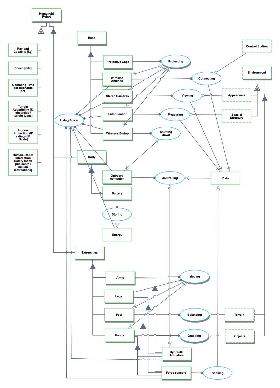 The OPM diagram below represents the structure and behavior of the humanoid robot designed for search and rescue missions. It organizes the system into its main components, head, body, and extremities, and the processes that connect them, such as moving, sensing, protecting, and controlling. Each element contributes to how the robot interacts with the environment, performs tasks, and maintains stability and safety while operating in hazardous conditions.
