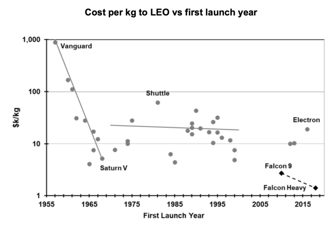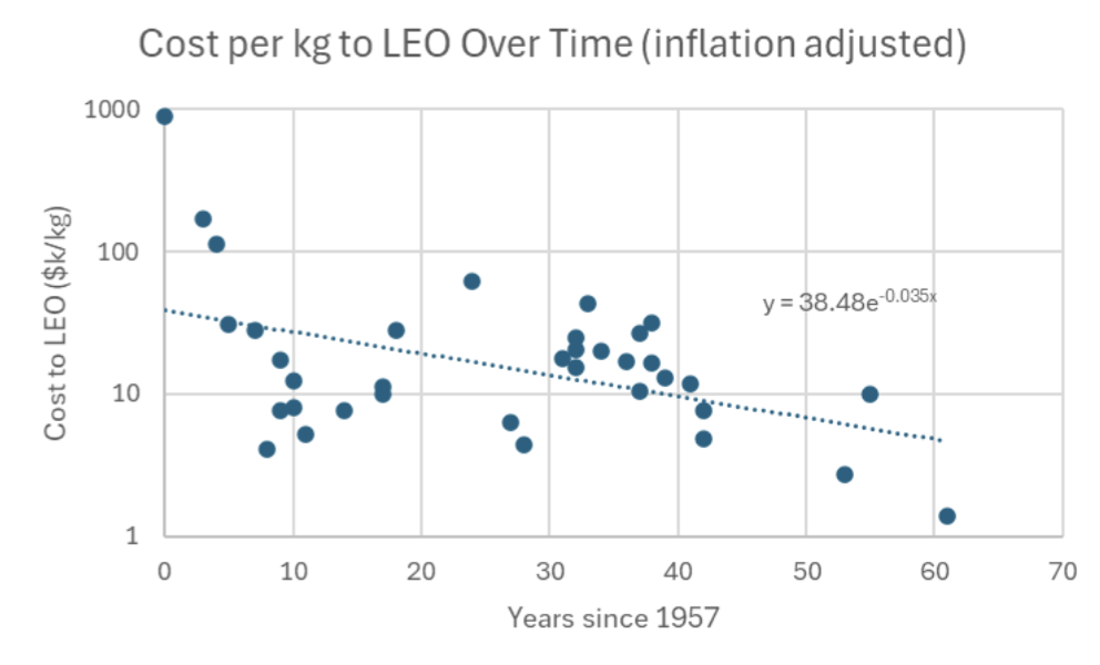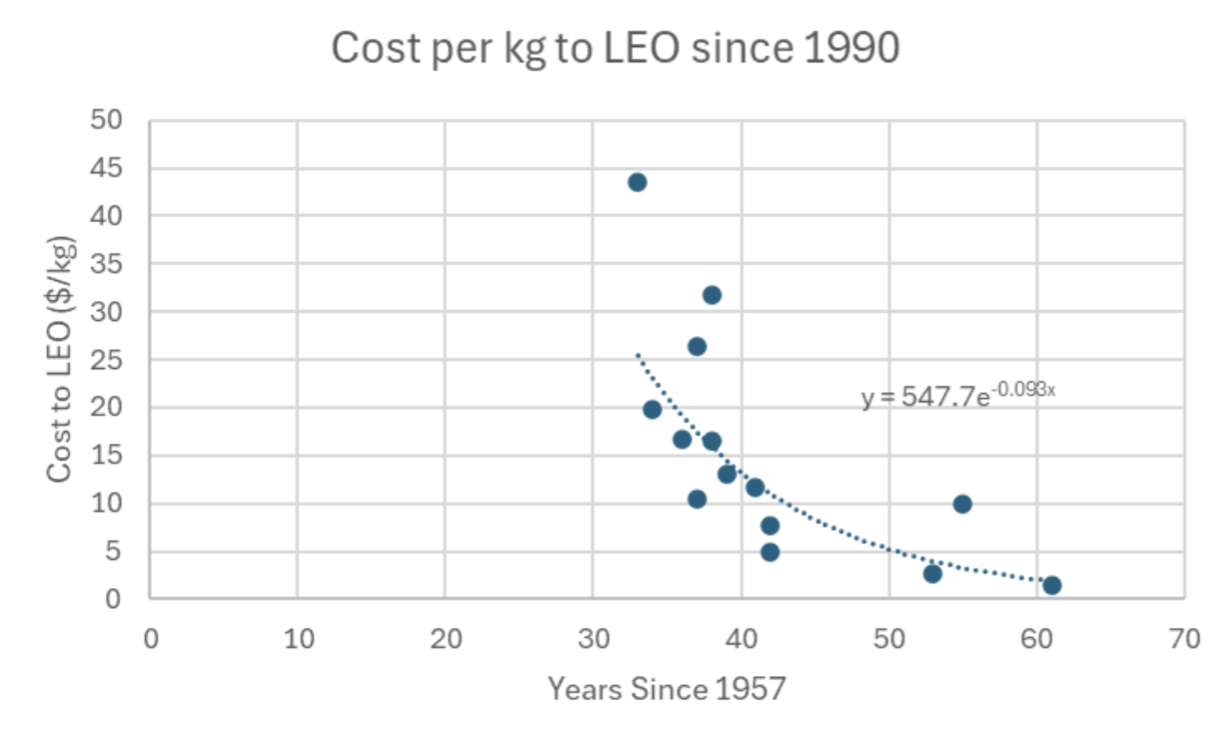 This figure illustrates several interesting trends. For one, the early space race lowered the cost to orbit dramatically with the Saturn V program. However, after the Apollo program ended there was a period of relative cost stagnation and even increase with the Space shuttle. Most recently, trends with reusable rockets such as Falcon 9 and others in development at Blue Origin have sparked new cost savings. However, only limited data is available on the latest generation of reusable launch vehicles. Attempting to calculate the average improvement can be modelled fairly easily, and is shown below: