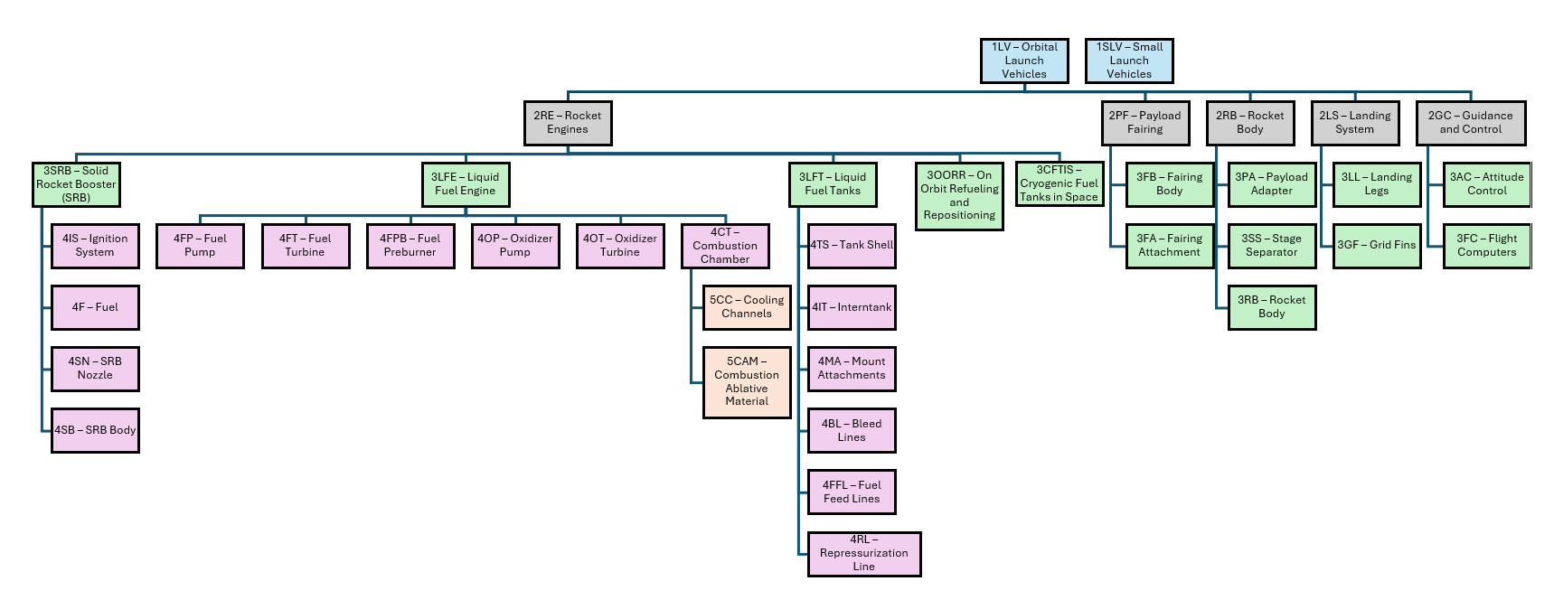 By decomposing several representative systems (propulsion, communication, guidance) into their first-level subsystems, we articulate both the flow of matter through the launch vehicle object, but also the level of complexity underlying the launch vehicle system. This complexity is helpful to keep in mind for the R&D segment of this roadmap, as we describe how advancements in modularization and streamlining of production processes has potential to significantly reduce costs. The scale of improvement possible for these goals is best considered in parallel to the scale and number of complex, interrelated, and frequently non-reusable subsystem objects.