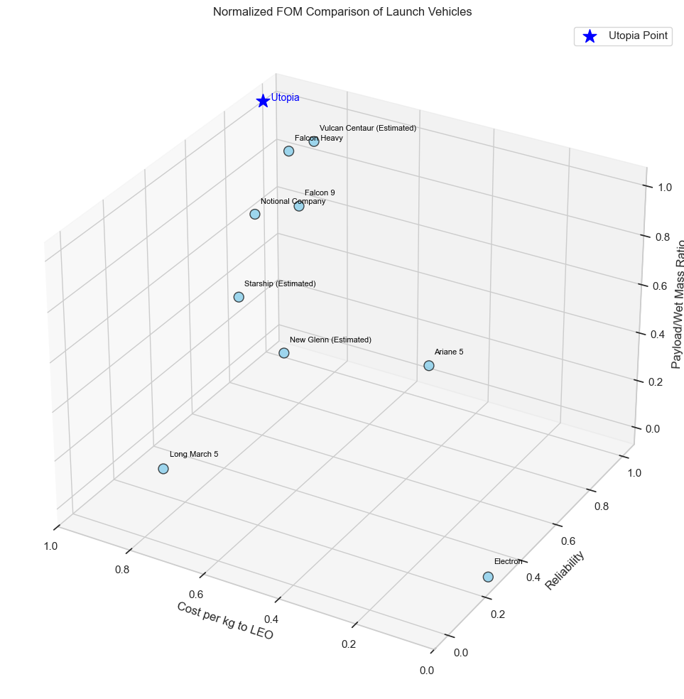 Due to the sparseness and uncertainty of data, we visualize those with the most robust available datasets: cost per kg to LEO, payload to mass ratio, and reliability. To better display the data all values were normalized. Note that in this case estimated FOM values for Starship, New Glenn, and Vulcan Centaur were used.