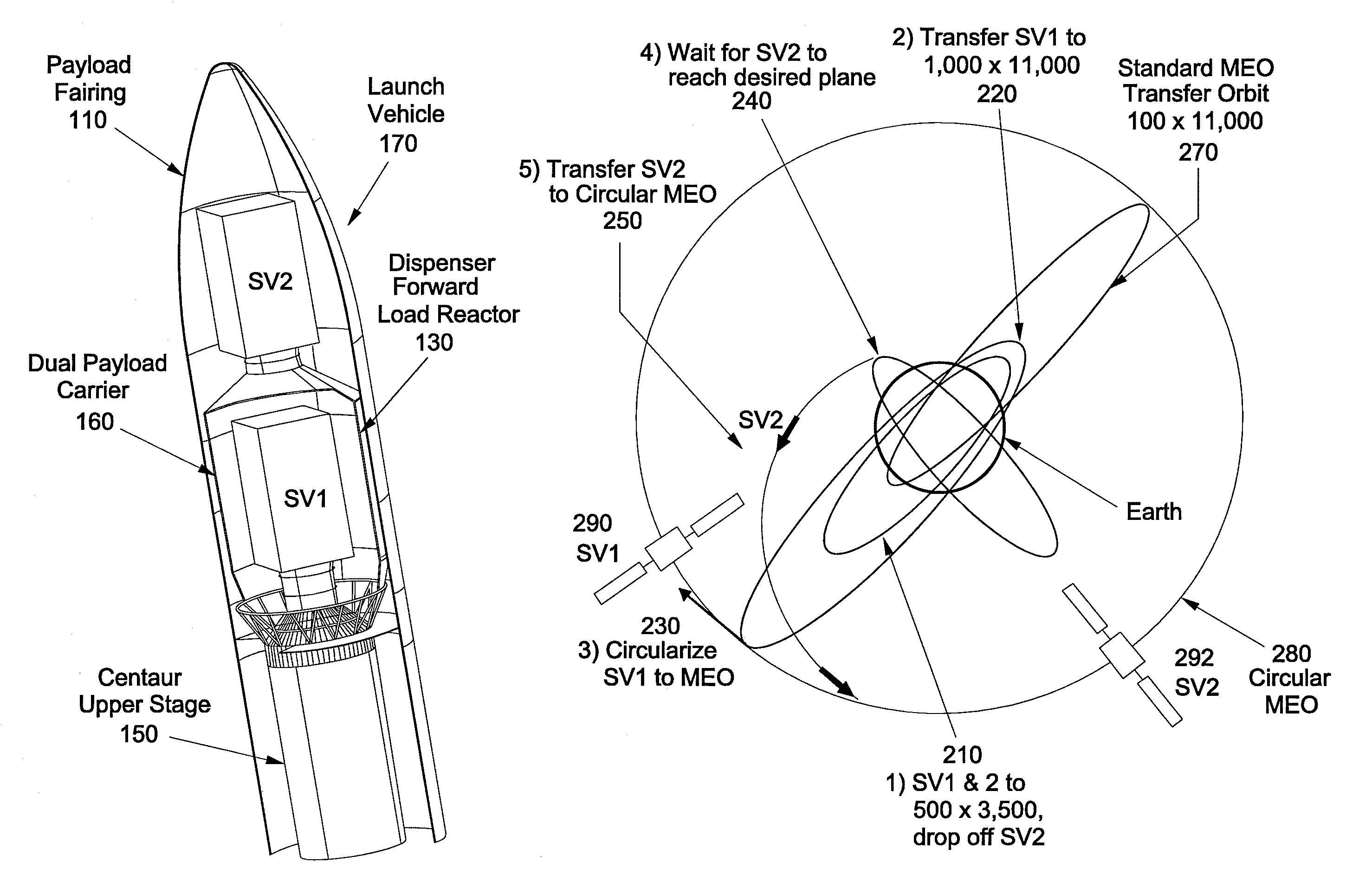 The first patent we selected was filing US7832687B1 for “On-orbit storage, plane change, and injection to final orbit of space vehicles”. This patent was filed by Lockheed Martin Corporation and relates to the payload connecter system and describes a method to “stack” multiple space vehicles on top of each other to allow for spacecraft to be deployed from the same rocket in different orbits. While this is not an accomplishment today, in 2009 this was a novel thought and this patent, amongst others that describe deployment mechanisms, allows greater flexibility for launch vehicles to deploy spacecraft. Especially given the large size of emerging reusable vehicles like Starship and New Glenn, the ability to deploy to multiple orbits in the same launch is important. This patent, while active at one point, has since expired and has not been renewed.