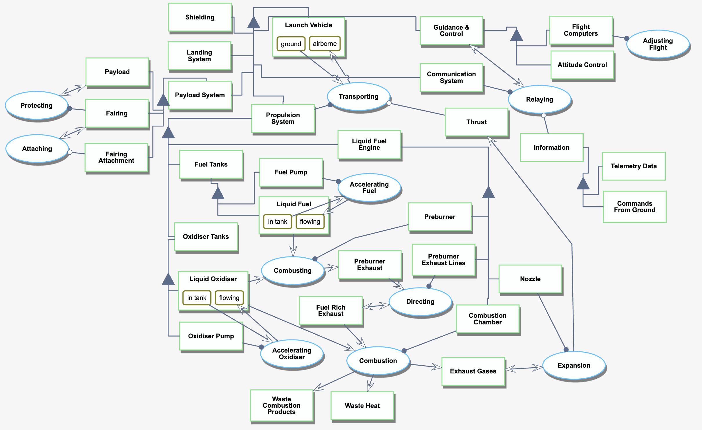 This Objective Process Diagram shows the high-level operation of Orbital Launch Vehicles. The fundamental operation mapped here is transporting the launch vehicle system from its ground to airborne state.