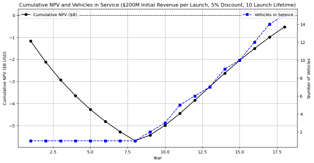 The model shows interesting results. Firstly, given the initial assumptions, charging 100x the idealized Starship launch cost of $2M, the system does not obtain a positive cumulative NPV until over a decade after initial commercial use.