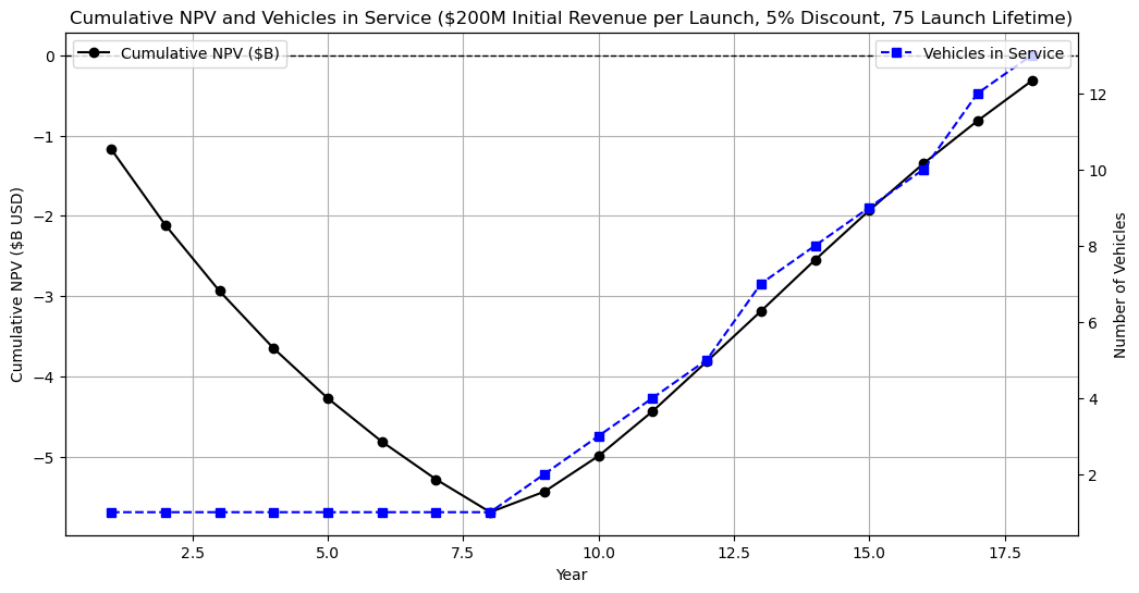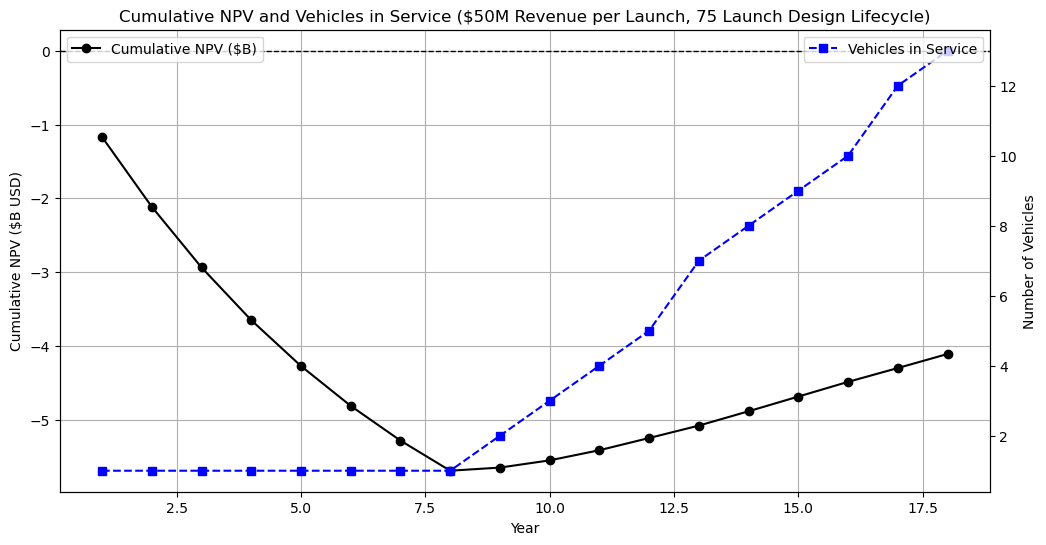 To compute NPV cases were made for 10 and 75 launches per vehicle using the revenue cases described above. These scenarios were computed over a 10 year time horizon with 8 years of development starting in 2020 and a linear growth of 2 launches per year. For simplicity, the expense of a new vehicle was only incurred when the vehicle extended past its design lifecycle. No failure rate was assumed or predicted.