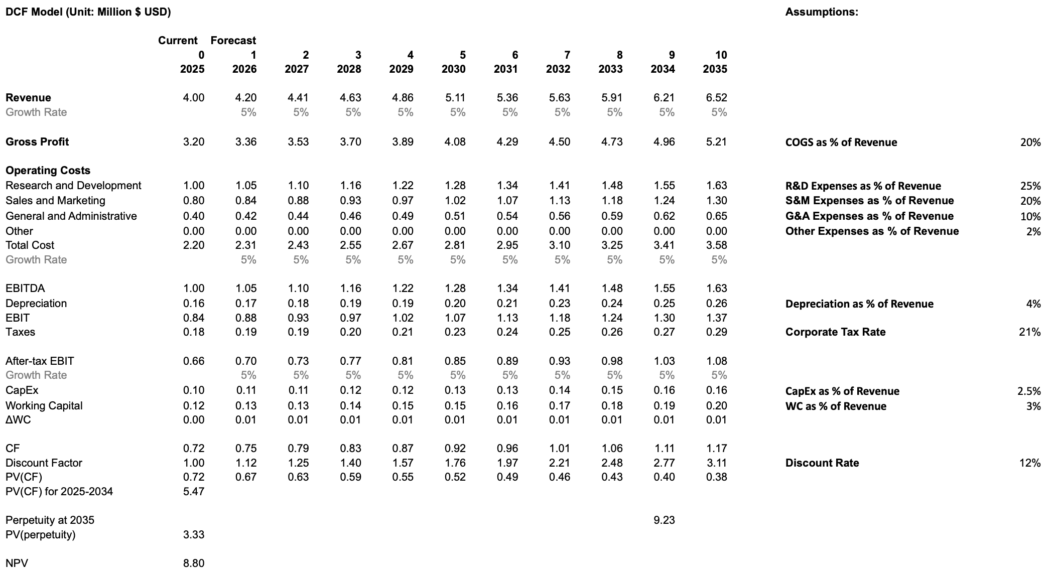 In the baseline case, the company continues investing at levels consistent with BI and SaaS industry norms. R&D and Sales & Marketing remain moderate, supporting steady feature development and stable customer acquisition without materially altering the company’s competitive trajectory. Revenue growth remains modest, reflecting incremental improvements to the platform and the natural stickiness of enterprise BI adoption. This approach generates positive cash flows earlier, maintains controlled operating expenses, and produces a conservative free cash flow profile. Under these assumptions, the DCF yields an NPV of 8.80M, representing the value of the company if it continues along a typical, disciplined SaaS growth path.