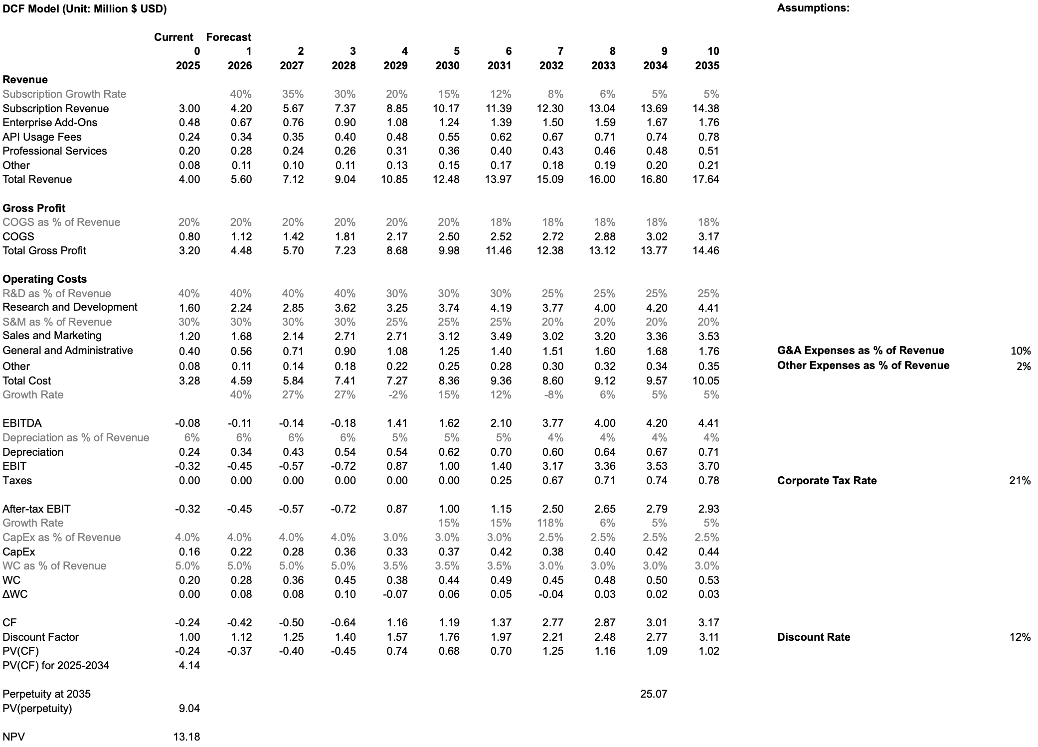 In the rapid growth case, the company front-loads investment into R&D to accelerate development of AI-assisted analytics, automation capabilities, and new compute-intensive features. Sales & Marketing intensity is also increased to rapidly scale adoption and capitalize on the output of these R&D initiatives. This strategy generates deeper negative free cash flows in early years due to higher operating expenses, but drives significantly higher long-term revenue growth, platform adoption, and competitive differentiation. Once operating leverage materializes in later years, the business achieves substantially larger steady-state free cash flows and a much higher terminal value. Under this accelerated investment profile, the DCF yields an NPV of 13.18M, indicating a materially higher long-term enterprise value relative to the status quo.
