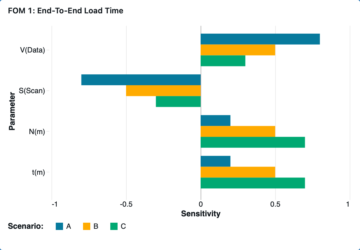 We model three representative dashboard scenarios to show how interpretation complexity and reload scale shift the balance between interpretation and reload time, shaping the sensitivities in the tornado chart.