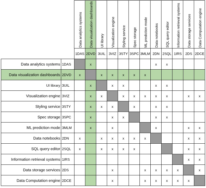 | Chart Variety | Number of different types of charts that can be created, including sub-types. Four different examples are “bar chart”, “scatterplot”, “scatterplot with variable-size points”, and “histogram”. | Count | More chart variety means the dashboard technology allows more flexible ways to express the same data. | Stagnating |
