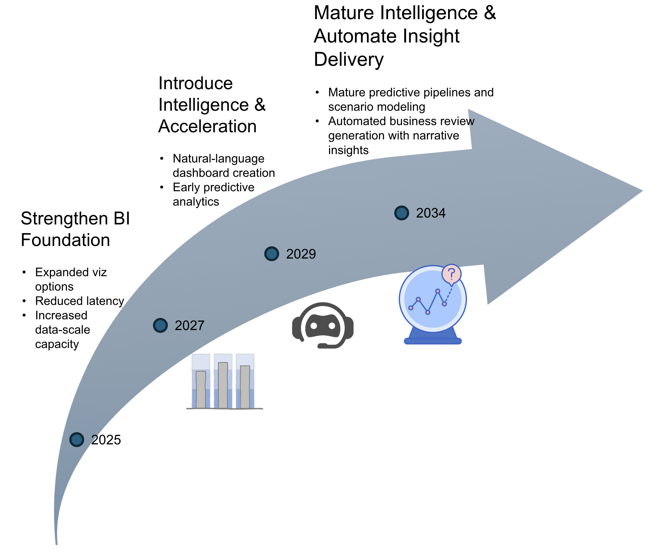 Initial efforts center on reinforcing the BI foundation through richer visualizations, better performance, and improved data-scale capacity. These upgrades enable more complex analytical workloads and set the stage for intelligence-driven capabilities. The mid-stage focus introduces natural-language dashboard creation and early predictive models that accelerate the path to insight. The long-term emphasis moves toward mature forecasting pipelines and automated business review generation. This progression reflects a deliberate move from foundational enhancements to increasingly automated and insight-driven analytics, with each stage enabling the next.