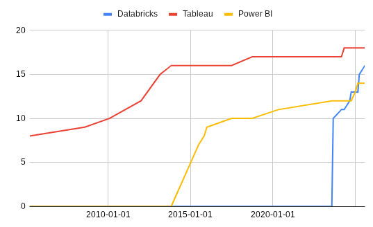 | Connector Breath | Number of distinct data storage services supported natively. | Count | Shows applicability of dashboards across a data ecosystem. | Increasing slowly |