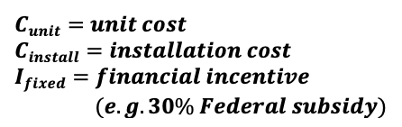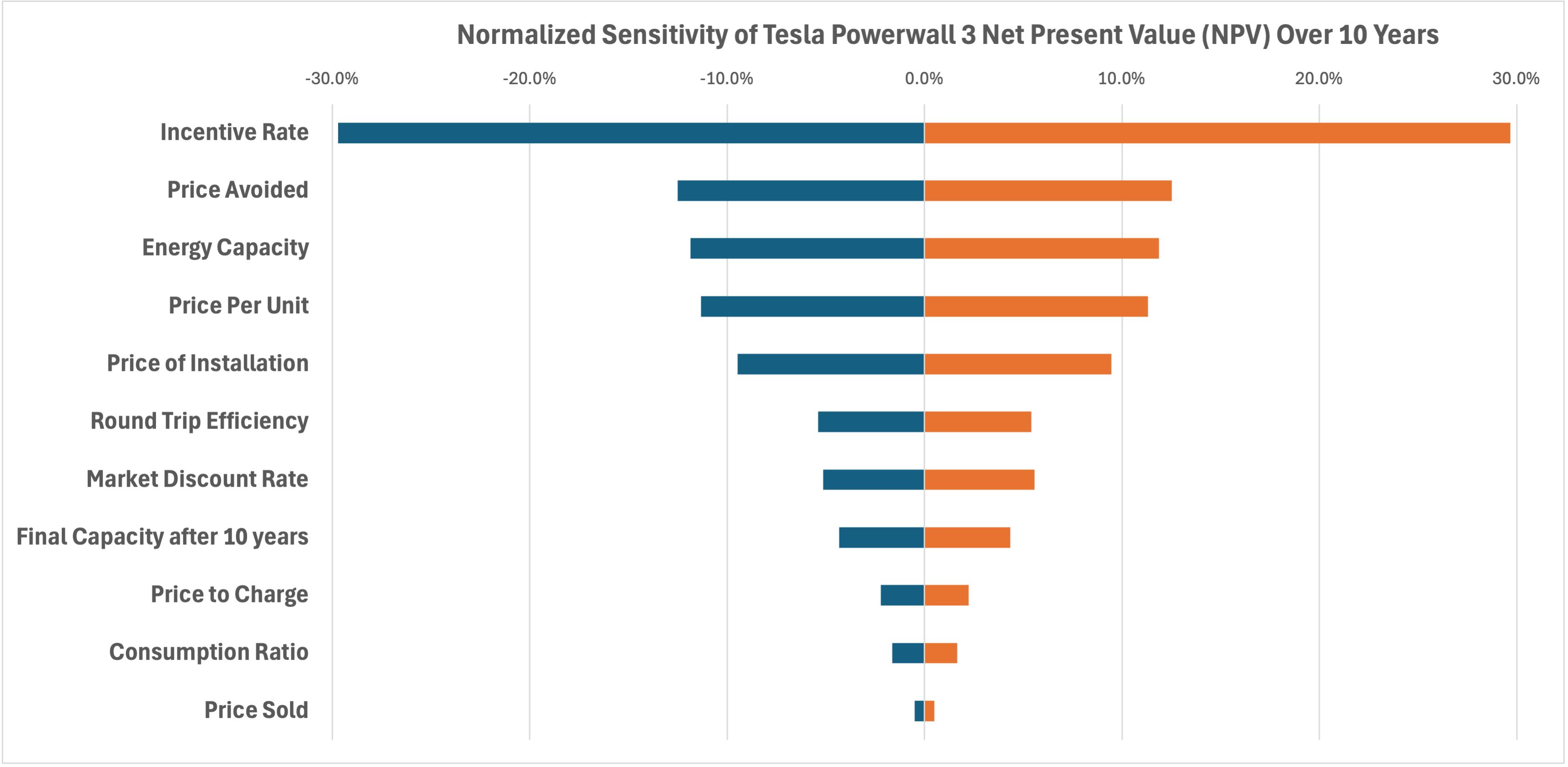 | Incentive Rate | It should be noted that we chose a larger % change instead of a standard +10%. This was to mimic actual market conditions (e.g. 30% federal + local subsidies + utility subsidies vs. 0 subsidies) |
