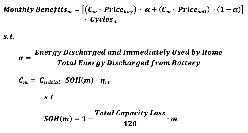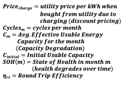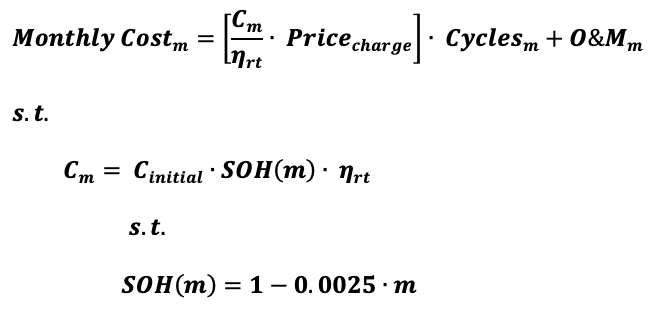 Monthly costs per month is the available capacity / Round-trip efficiency (you have to make up for what you lost during discharged) times the cost buying from the grid during low cost periods