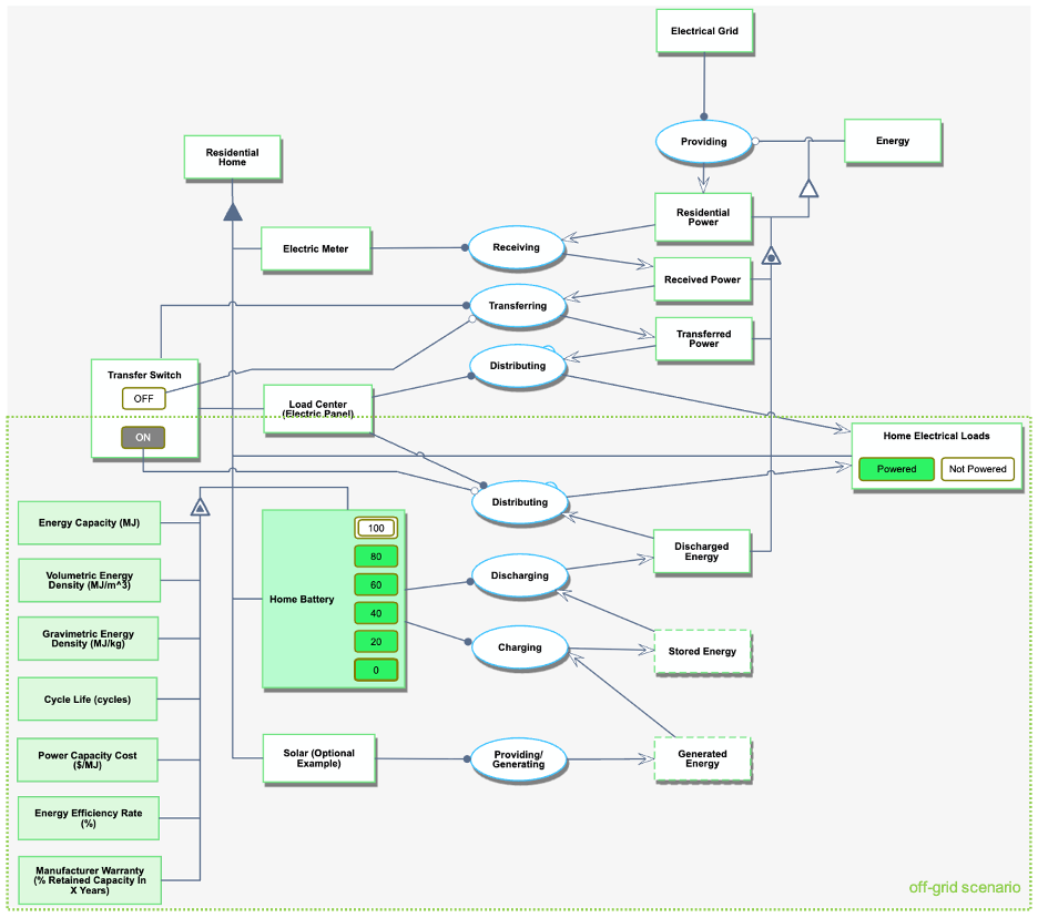 This Object-Process Diagram (OPD) showcases the scope of a residential battery system, illustrating the scenario of powering home electrical loads by providing stored energy while "off-grid". The model includes the system's interaction with the electrical grid, a residential home, and an optional solar installation. This example assumes the residence has a transfer switch allowing it to disconnect from the electrical grid, with the battery having been previously charged.