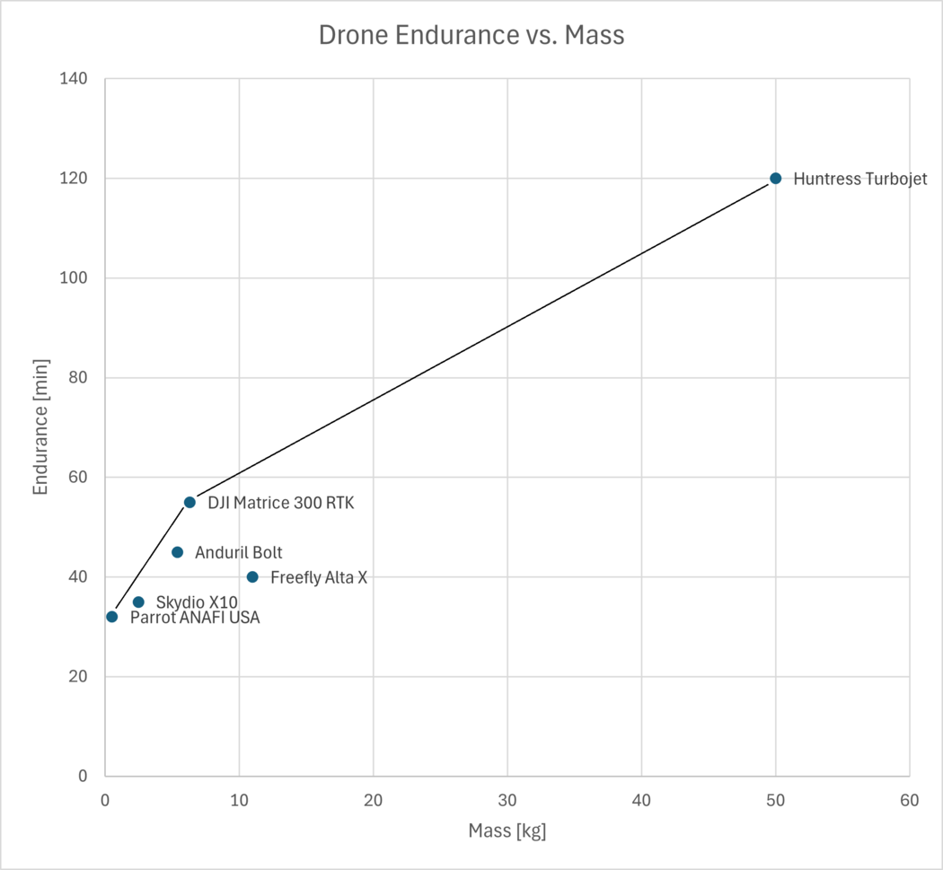 The Parrot ANAFI, Anduril Bolt and Huntress Turbojet are some products that exist on the pareto frontier of both range and endurance. These drones also exhibit differences in use cases that make sense at their positions of the pareto front.