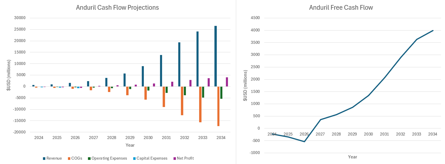 Anduril is one of the companies at the forefront of drone swarm development. Their Lattice software allows different drones and other autonomous agents to communicate and operate together to perform a military task. This technology as a whole has the potential to generate lots of positive free cash flow since the operating model of drone swarms allows it to have different business model dynamics than the traditional cost plus model of defense companies. For example, the cost of goods sold (65%) is lower for military drone swarms since drones are made from commodity materials. Drones being unmanned also reduces complexity. Since autonomous software is a major component of this business, in the long run, the operating costs will be similar to those of a software-as-a-service company (20%). The defense spending is expected to continue increasing at 3.5% annually which will become the perpetual free cash flow growth rate for Anduril. To accelerate growth, the company plans to invest over $1.5 billion by 2026. Based on these projections, the company has a net present value of roughly $14 billion which aligns with its current valuation.
