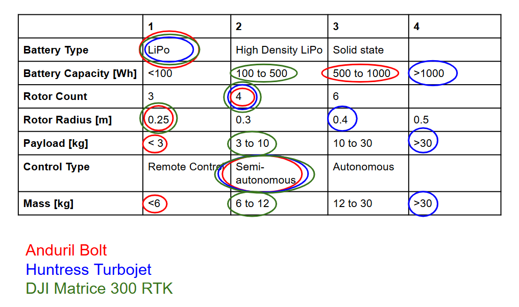 Analyzing the morphological matrix of the drones at the pareto frontier, we see design convergence with regard to battery type, rotor count and control type. The differences that contribute to variations in the endurance and range FOMs are mainly determined by battery capacity, mass and payload. The DJI Matrice does well with its relatively smaller battery capacity yet still having an endurance limit on the pareto front.