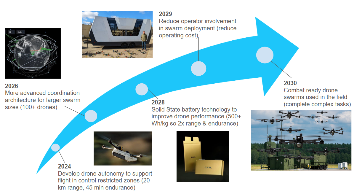 The target is to develop autonomous drone swarm systems capable of accomplishing complex military operations by 2030. In order to accomplish this goal, there needs to be key advances in autonomous navigation and control systems, swarm architectures and improvements in drone performance metrics. The first technology to invest in is Anduril's Lattice to enable the control of more than 100 drones by 2026. CATL's Solid state batteries will also get investment to double the drone endurance for the same weight class by 2028. Finally, investments into drone infrastructure to reduce operational costs will pay off in 2029. These investments will enable drone swarms to accomplish complex tasks by 2030.