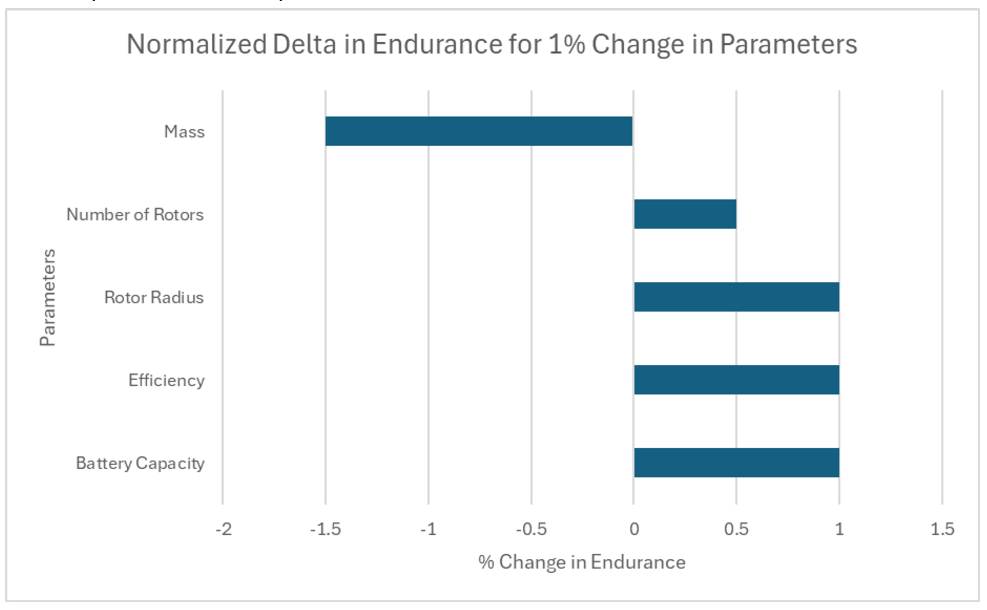 We can observe that the endurance is affected by the battery capacity, efficiency, rotor radius, number of rotors and mass of the drone.