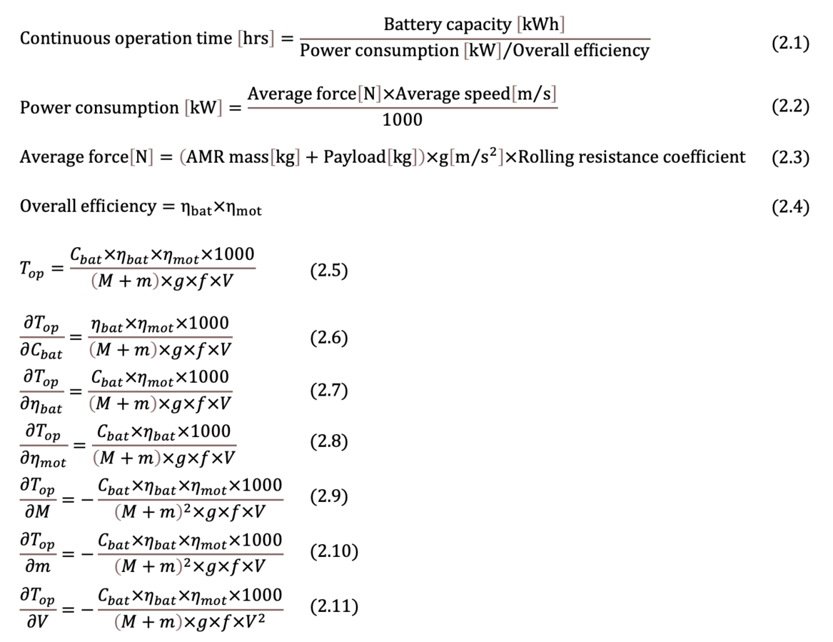 Continuous operation time is the total time the AMR can operate in one single charge and affects the picking rate, as mentioned above. Using the definition provided by (2.1) and some additional descriptions (2.2) to (2.4), we derive the equation for continuous operation time as shown in (2.5). Partial derivatives are calculated in (2.6) to (2.11), accompanied by a list of variables.