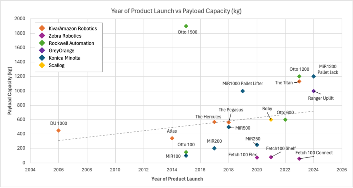 Following is the trend of payload capacity for AMRs by various manufacturers developed since 2006, where we can see a steady improvement in performance.
