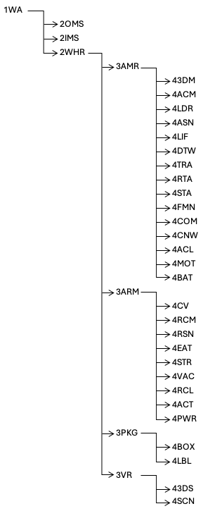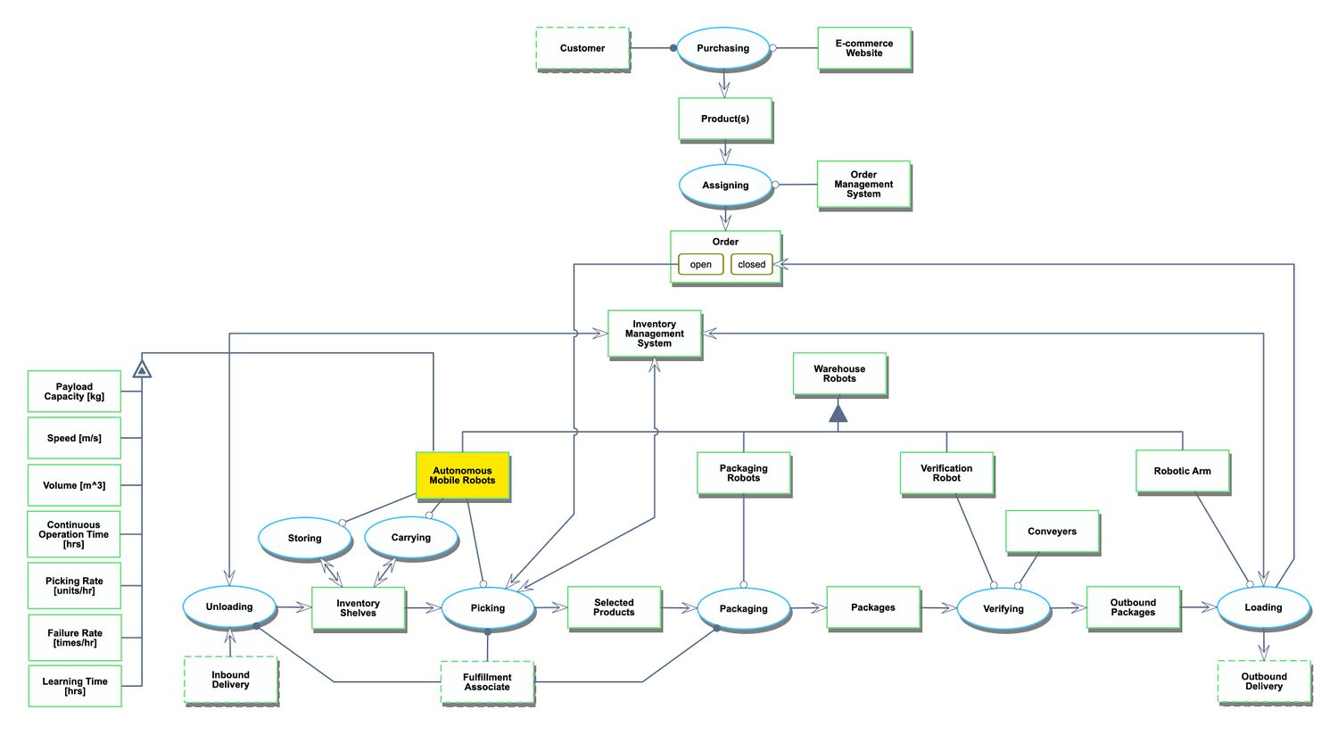 We present the OPM for warehouse automation and the role of autonomous mobile robots (our main interest for our level 3 roadmap, shown in yellow). In preparation for warehouse operations, inbound delivery to the warehouse is unloaded and stored in inventory shelves that are carried by AMRs. When a customer purchases a product on the e-commerce website, the order management system assigns an order to the warehouse, which initiates the picking and packaging processes: AMRs carry themselves to the fulfillment associate who picks the purchased products, packaging robots assist the fulfillment associate in packaging, packages are transported on conveyor belts as they are verified (scanned) by verification robots, and finally the outbound packages are loaded onto trucks by robotic arms and shipped out as outbound delivery. Throughout the process, the inventory management system tracks the inventory in the warehouse at the unloading, picking, and loading stages.
