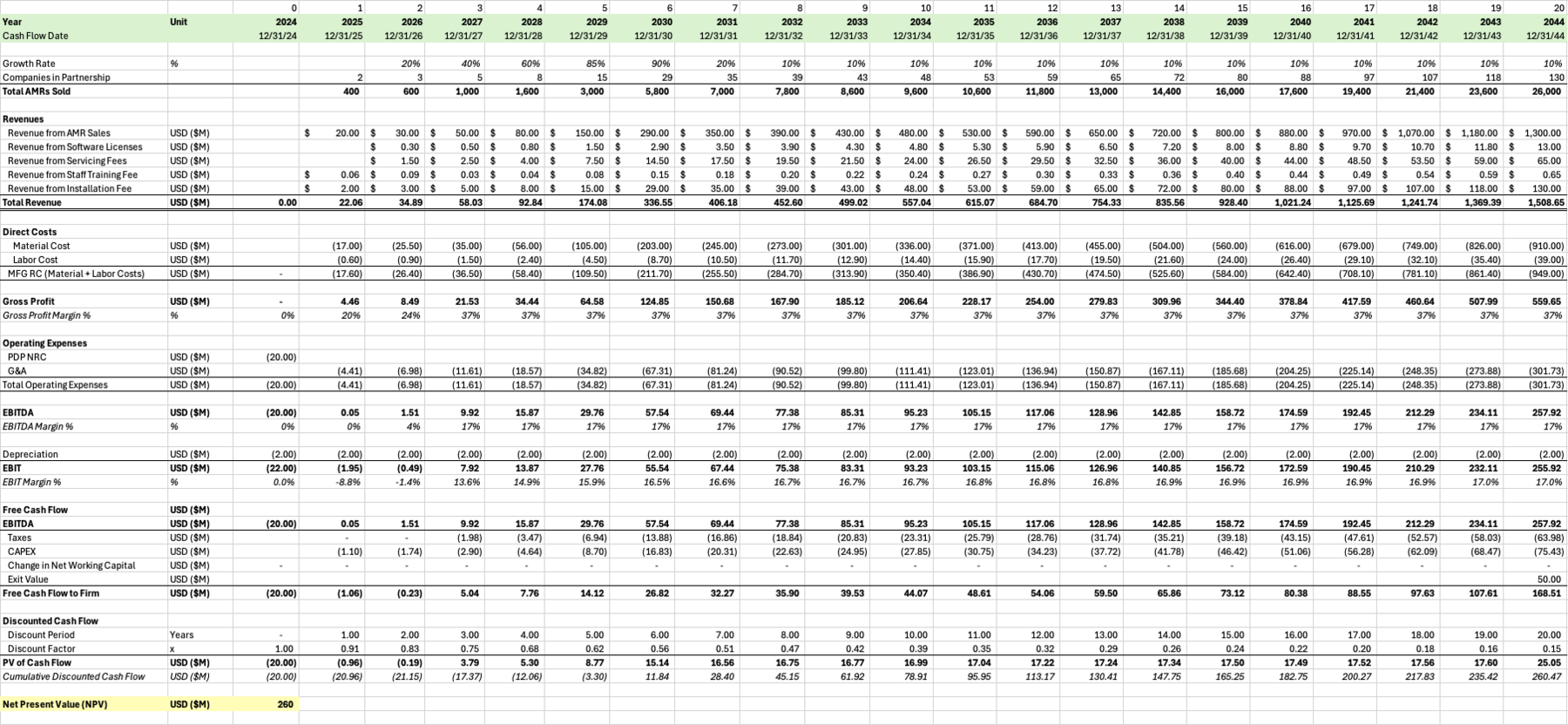 The figure below presents the financial model for AMR sales and associated revenue streams over the 20-year timeline. The model outlines the Product Development Program Non-Recurring Costs (PDP NRC) incurred in the first two years, which represent one-time costs for research, design, and engineering to establish the production line and additional components. The Manufacturing Recurring Costs (MFG RC) includes the material costs and labor costs required for production.