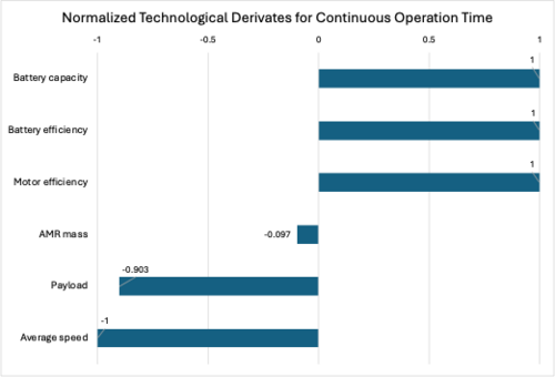 Similarly, the partial derivatives are normalized and plotted on a tornado chart. Sensitivity is calculated here based on Kiva/Amazon Robotics "The Pegasus" whose weight M = 60 [kg] and max load capacity m = 560 [kg]. The results show that increasing battery capacity, battery efficiency, and motor efficiency improves continuous operation time. We also note that although suggested from the tornado chart, we will not decrease payload or average speed as they negatively impact the efficiency of the overall warehouse automation.