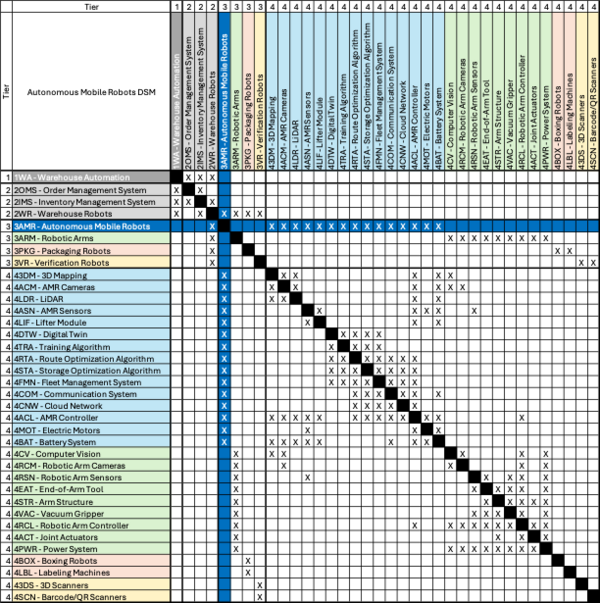 The DSM allocation of autonomous mobile robots and its tree are shown below. The company-wide initiative of warehouse automation is supported by the order management system, the inventory management system, and warehouse robots. Warehouse robots can be classified into autonomous mobile robots, robotic arms, packaging robots, and verification robots. We focus on the autonomous mobile robot for this roadmap, which is enabled by level 4 technologies in light blue, such as 3D mapping, digital twins, and route optimation algorithms. The DSM shows coupling between technologies; for example, the development of the lifter module is dependent on the performance of sensors, the controller, and the battery system.