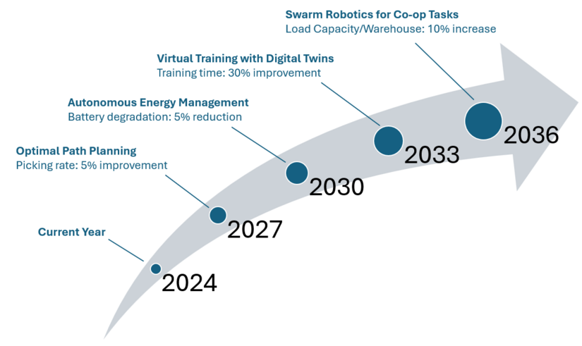 By 2036, our objective is to develop an autonomous mobile robot that can be rapidly trained and deployed to transform warehouse operations and enhance efficiency. We aim to increase picking rate and streamline warehouse workflows by improving path planning capabilities by 2027. By 2030, we will deploy an autonomous energy management technology to minimize battery degradation, ensuring longer operational life and enhanced reliability. We plan on investing in digital twin technologies to to expedite robot training processes, reducing deployment time and enhancing performance accuracy by 2033. Finally, we plan to develop advanced swarm robotics algorithms that allow robots to cooperate with each other to accomplish a task increasing the load capacity for a warehouse by 10%. Through this roadmap, we are committed to revolutionizing warehouse logistics with cutting-edge robotics and technology innovation.