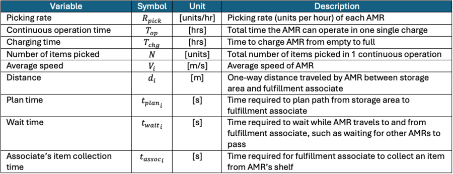 The picking rate of AMR represents its effectiveness in warehouse automation and is defined by (1.1). Using additional definitions provided by (1.2) to (1.5), the equation for the picking rate can be derived as described in (1.6). Here, we assume that all AMRs start their trip from the storage area and travel to the fulfillment associate, and that they return to the storage area once the picking is complete. The partial derivatives of the picking rate with respect to each variable can be calculated as shown in (1.7) to (1.13). A list of variables used in equations is also provided below.