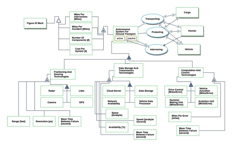 We provide an Object-Process-Diagram (OPD) of the 2ASGT roadmap in the figure below. This diagram captures the main object of the roadmap (Autonomous System for Ground Transport), its 2-level decomposition into enabling systems (Positioning and Sensing Technologies, Data Storage and Transmission Technologies, Computation and Control Technologies), its characterization by Figures of Merit (FOMs) as well as the main processes and other objects it interacts with.