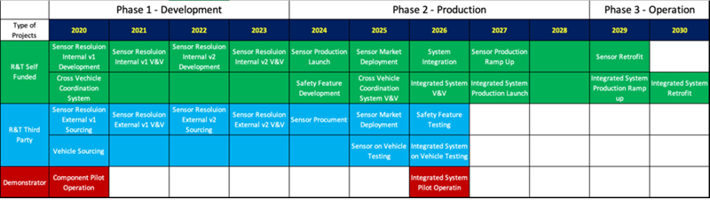 The relevant R&D and R&T projects are to be completed in three phases, development, production, and operation. The sensor development would be conducted both internally and externally in order to pursue a higher component performance. The vehicle perception coordination system, as the core technical competency of the company, would be researched and produced mostly internally. Control system redundancy feature would be kicked off after the two aforementioned system are practically verified and validated.