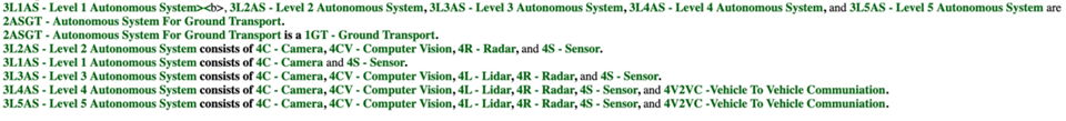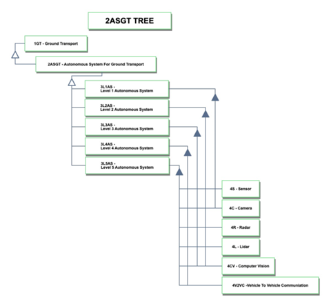 The autonomous system for ground transport technology sits at level 2 abstraction and is a specification of ground transport at level 1. It can be classified into 5 different level of autonomy.